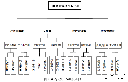 QH 保险集团行政中心主要职责为围绕公司战略目标,全面对公司各项综合事务进行管理协调,确保公司的正常运营及发展。行政中心是集团核心的公共资源部门,负责公司行政管理、机要文秘、集中采购、职场规划与建设等工作的全面统筹,为保证公司正常运转提供各项综合服务。其架构如图 2-6 所示。
