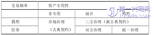 企业集团是企业的联合体,它的形成方式和治理方式都和单一实体公司并不一致。有学者指出企业集团是企业边界动态模糊的实现方式,42企业集团内部的分权程度要比一体化的公司更高,企业联合只是一种特殊的组织形式,并非是一个独立的法人实体。但是企业集团因为内部企业的联结性又区别于单纯的企业集合。笔者以为,可以从契约理论出发对企业集团进行基本解释,并由此展开分析。契约安排是市场交易的前提之一,契约反映了促进交换的不同方式。威廉姆森对对应交易治理结构的契约安排做了基本分析: