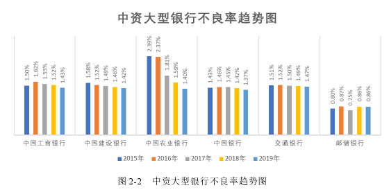 从中资大型银行近些年不良率指标来看,2015-2019 年期间,在中资大型银行当中除中国农业银行在 2015 年、2016 年不良率在 2%以上,剩余中资大型银行的信用卡不良率均保持在 2%以下的较低水平,并呈现逐年下降的趋势。由此可见,我国中资大型银行的信用风险基本上能够保持在一个相对平稳的水平。