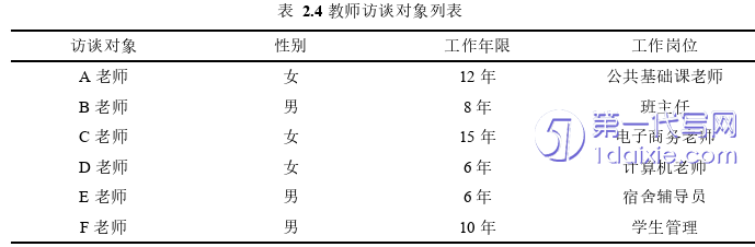 为更全面了解江西X技师学院中职生的学习动力现状,从公共课老师、专业老师、班主任、辅导员等岗位选取了5年工作经验以上的6名教师作为访谈对象(本文所有的真实姓名和单位均以大写字母代替)。被访教师对象基本信息如表2.4所示。
