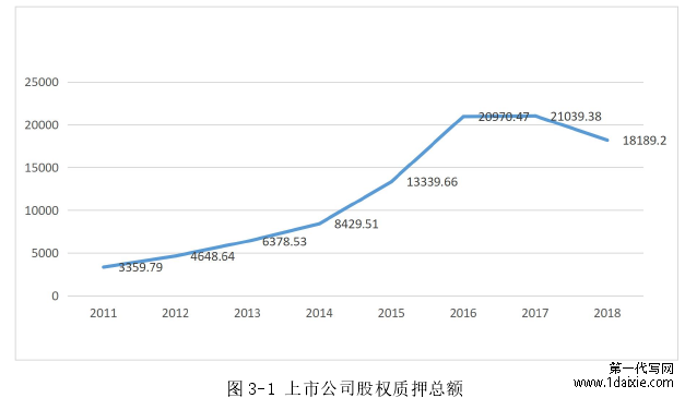 自 2014 年来,在我国的股票市场上,无论是股权质押的规模还是利用该方法进行融资的企业的数量都有所增加。统计表明,运用股权质押这一方法进行融资的企业由 1995 年的不足百家发展到现在已经超过了 3500 家企业,而该部分企业用于股权质押的股票其市场价值竟然达到了惊人的 6.15 亿,至 2018 年 10 月,