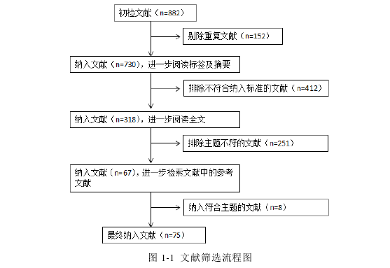 按照检索策略,阅读文献标题及摘要,对文献初步检索,按照纳入与排除标准严格筛查检索到的文献。并进一步获取纳入文献全文,通过人工检索获取文献的参考文献进一步检索,最终对文献进行内容提取、总结,共纳入文献 75 篇。