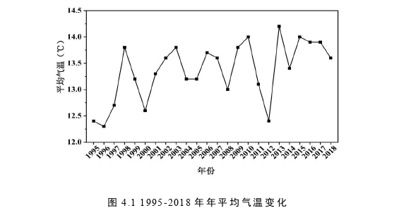 在自 然因 素中基 于研究 区实际 调查与研究选 取了气温因 素与降水因 素作为自然驱动了因素,气温如图4.1所示,威宁县近23年来年平均气温值变化波动还是较大,从整体上看,年平均气温呈升高变化趋势。气温值的升高,对景观格局变化有一定影响。