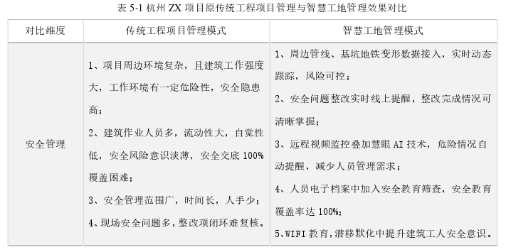 具体比较内容是杭州 ZX 项目原先在传统工程管理形式下安全、质量、进度、机械、人员、绿色文明施工管理情况,与借助数字化技术建设智慧工地形式下项目安全、质量、进度、机械、人员、绿色文明施工六大维度的管理现状对比评价,详细比较内容如表 5-1 所示。