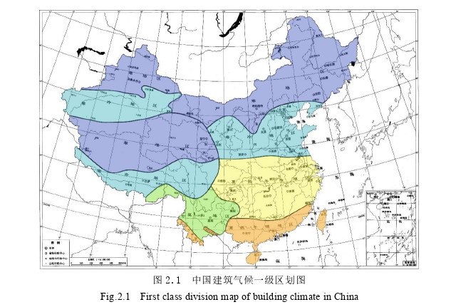 依照 2019 年 10 月 1 日生效的《民用建筑设计统一标准》(GB50352-2019)[15]和1993 年 7 月 5 日发布的《建筑气候区划标准》(GB50178-93)[16],可以清晰的了解到我国建筑气候划分情况。我国的一级建筑气候区一共划分为 7 个,包括严寒地区、寒冷地区、夏热冬冷地区等,具体分布如图 2.1 所示。