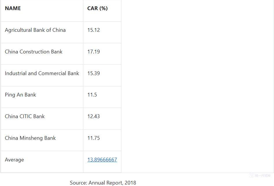 The capital adequacy ratio (see Table 3.) is refers the total equity to risk-weighted assets ratio (see Appendix A, A1). All the data are coming from the annual report of 6 Chinese banks (Annual Report, 2018).