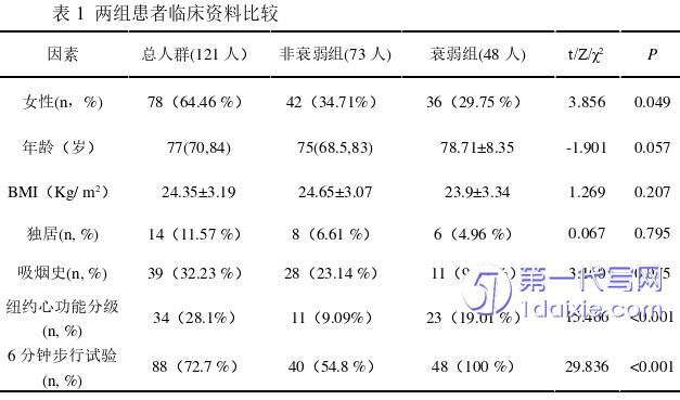 本研究前期共纳入125名患者,其中衰弱组48人,非衰弱组73人,有4例患者失访,共计121例,失访率3.2 %。结果衰弱组与非衰弱组在性别(0=男性,1=女性)、6分钟步行试验(0=<300米,1=≥300米)、纽约心功能分级(0=Ⅰ-Ⅱ级,1=Ⅲ-Ⅳ级)有统计学差异(P<0.05)。两组在年龄、BMI、是否独居(0=与家人同住,1=独居)、吸烟史(0=无吸烟史,1=有吸烟史)无统计学差异(P>0.05)。(见表1)