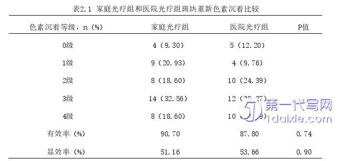 家庭光疗组和医院光疗组患者308nm准分子光疗3个月后目标斑块黑色素恢复的有效率、显效率,经卡方检验,P>0.05,差异无统计学意义。见表2.1。