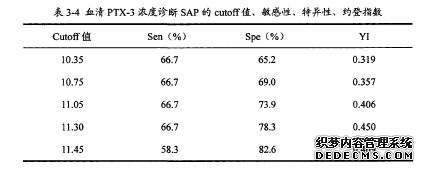 (1)血清PTX-3与AP严重程度相关,可作为AP病情早期预测的参考指标,诊断界值为11.30ng/ml时,对SAP的诊断效能最大。