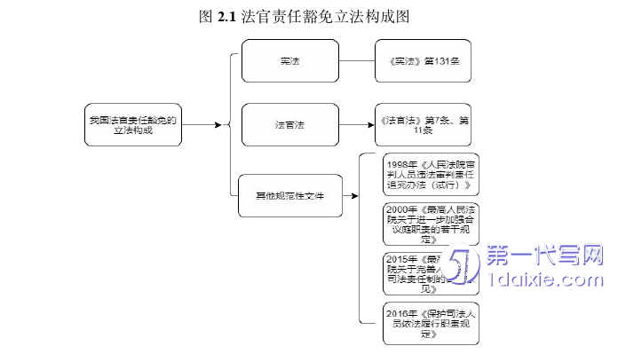 目前,我国法官责任豁免制度的规定散见于《法官法》、《国家赔偿法》、《人民法院审判人员违法审判责任追究办法(试行)》、《保护司法人员依法履行职责的规定》、《关于完善人民法院司法责任制的若干意见》、《最高人民法院关于进一步加强合议庭职责的若干规定》等法律文件中。《法官法》和《国家赔偿法》中对法官责任豁免的规定十分不明确,较为模糊。比如:《法官法》仅在第11条关于法官的权利中提到责任豁免。《国家赔偿法》只是规定法官享有民事责任豁免权,此种豁免权不是完全意义上的豁免,是有限度的豁免。其他规定多出自于最高人民法院以及中共中央办公厅、国务院办公厅的规范性文件中。基于此,笔者绘制了一个思维导图(如图2.1所示),可以清晰地看到构成法官责任豁免制度的立法构成。
