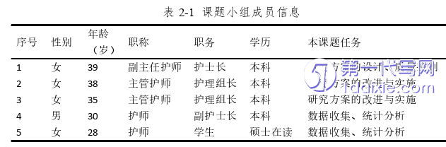 题组共有成员5名,其中重症医学科护士长2名、重症医学科护理组长2名及在读研究生1名。其中护士长担任课题组组长,负责指导研究方案的设计和质量控制,两名护理组长负责协助研究方案的改进与实施,副护士长和研究生本人负责数据收集及统计分析。课题小组成员基本信息见表2-1。