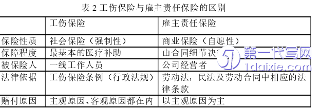 二者的最大两个区别在于性质和保障程度。工伤保险是一种社会保险,覆盖面更广,但是保障程度较低,无法弥补雇员因工伤遭受的损失;雇主责任险则是一种商业保险,需要雇主这一被保险人与保险公司签订保险合同,覆盖面较为狭窄,但保障程度可以根据保费的多寡来进行灵活调节,主要不是雇员故意为之或者存在重大过失,保险公司都可以保障雇员受伤遭受的损失。但工伤保险一般不会考虑是否存在雇员故意或者重大过失等问题,其可以作为雇主责任险的附加险而存在。另外,工伤保险中有较为明确的法律条款作为依据,而雇主责任险却并没有明确的法律条款进行依据的赔偿,只能适当的从《劳动法》、《民法》中的相关条款进行依据,二者的主要不同可见表2所示。