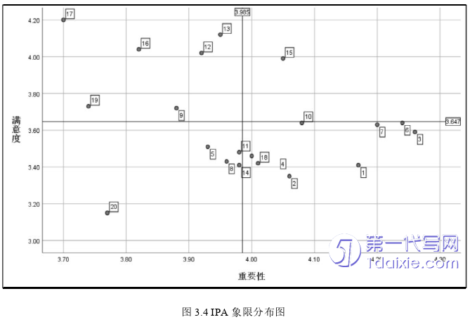 IPA分析法以绩效表现(满意度)为纵轴,重要性(重视度)为横轴,将两个因素的总体平均值作为分割点,将其划分为四个区域,从而实现了对绩效表现的全面评估。这四个区域分别是: