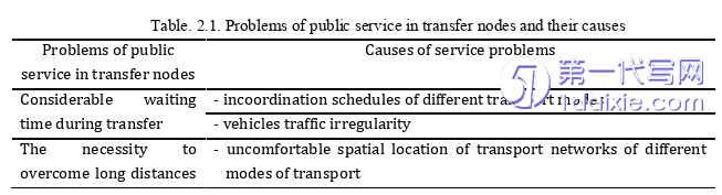 The importance of integrating and combining different types of passenger transport is recognized in many countries around the world. This fact explains the growing interest in the reorganization of the old and the formation of new transfer nodes. On the basis of them intermodal, multimodal transportations are carried out and passengers are transplanted within a certain mode of transport, as well as the introduction of a set of measures to increase their efficiency. Today, there is a tendency to expand the functions of modern transfer nodes: cultural and entertainment, trade, etc. are added to the main transport, and the efficiency of functioning should be considered taking into account economic, social and environmental aspects. There is no clear definition of the concept of “transfer nodes” yet, so the authors provide different options in their works. For example, the publication [17] uses the following definition: "Elements of the transport system in which the transport process begins, ends with one of the modes of transport or the interaction between main and urban modes of transport and redistribution of passenger flows". Other variants can be found in papers [18-20]. Mykola Pyshkin [21] formulated in his work the author's definition transfer nodes as follows: "The set of buildings, structures, devices, territory and transport infrastructure in a predetermined radius from a combination of two or more types of public passenger transport". In addition, along with the concept of “transfer nodes”, the following terms are found in the literature: transport and communication node, public and transport node, highly urbanized multifunctional node of urban structure. In each case, refers to an element of the transport infrastructure used by the public to perform relocate between different modes of transport within the network or one of them. The realities of nowadays show that, every day, thousands of passengers deal with the imperfection of public transport, which in many cities cannot be judged to be reliable and fast. Transit trips cause the greatest inconvenience for urban residents due to the presence of maintenance issues at the transfer nodes shown in Table. 2.1.