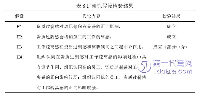 本研究在进行文献整理后,探究了资质过剩感影响员工离职倾向的具体机制。使用SPSS27,AMOS26软件对相关假设进行检验,发现实证结果支持相关假设,如表6.1所示。