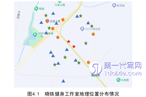 在晓铁健身工作室的市场细分中,地理位置被认为是最重要的因素之一。会员能否方便到达健身工作室,并在路途中节省精力和体力,这对其健身体验具有重要影响。晓铁健身工作室和青少年素质拓展中心位于S市街区主干道上(表示为红色星型图标)。该地区半径两公里内,包括名城花园、沈鹰小区等多个住宅居民区(表示为绿色的星型图标);此外还有莲花街小学、振动中学等12所中小学(表示为蓝色的三角形图标),以及设计研究院所等企事业单位(表示为橙色的圆形图标)。这些地理特征的存在使得晓铁健身工作室能够吸引周边居民、学校师生以及企事业单位工作的人群。