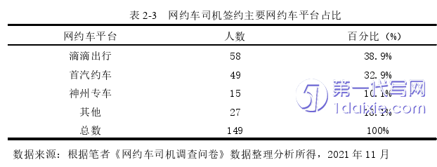 根据表2-3调查结果显示,参与调查的149位车主中,与滴滴出行签约的司机最多,为58人,首汽约车次之,为49人,第三是神州专车,占到了15人,排名前三的网约车司机签约平台的人数加起来占总人数的81.9%,是一个非常大的占比。其他虽然也有一些网约车司机也与其他平台签约,但是相较于前三个来说,占比较少。