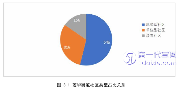 莲华街道办事处组建于1987年5月,2004年10月15日化整后,辖区面积从原来的3.348平方公里扩大为17.33平方公里,常住人口为16.9万人,流动人口近4万人。下辖7个地缘型社区(学府、苏家堂、教场东路、教场中路、教场北路、江岸、江北)、2个涉农社区(马村、虹山)、4个单位型社区(云南财经大学、昆明理工大学、昆明冶金高等专科学校、云南省第二监狱),共13个社区,其中地缘型社区占比最多,共占54%,涉农社区最少,只有15%。(如图3.1所示)辖区驻有150余个公共户单位,其中有大中专院校、中小学校、幼儿园共28家,科研单位11家、行政事业单位22家。本文调研的Z社区建于2005年,在莲华街道办事处整合时孕育而生,是典型的城市型社区。