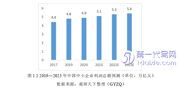 中小企业作为国家经济成长和繁荣的重要推动力,对于社会就业、创新活动以及国民经济的发展具有不可替代的作用。随着中国改革开放的深化,中小企业数量急剧增加,成为国民经济的不可或缺的一部分。据统计数据图1.1所示,2017年中国中小企业的利润总额达到了4.4万亿元人民币,而到2019年这一数字增长到了4.8万亿元人民币,预计在2023年将达到5.4万亿元,显示出强劲的增长势头。在全球经济一体化加速和国际交流频繁的背景下,中小企业已成为推动世界经济发展的关键力量。作为我国国民经济的最具活力的部分,中小企业在提供便利服务、创造就业、促进经济增长和激发企业活力方面发挥着关键作用。在当前的历史背景下,对于中国的中小企业来说,选择与自身相匹配的营销策略是企业持续发展的关键。因此对于占中国企业总数比重最大的中小企业而言,如何合理选择营销策略,已经成为企业界和理论界都必须高度关注的一个重要课题。本文以A公司为例,旨在探讨其营销策略,以期为中小企业在营销策略选择和营销策略优化方面提供参考和启示。
